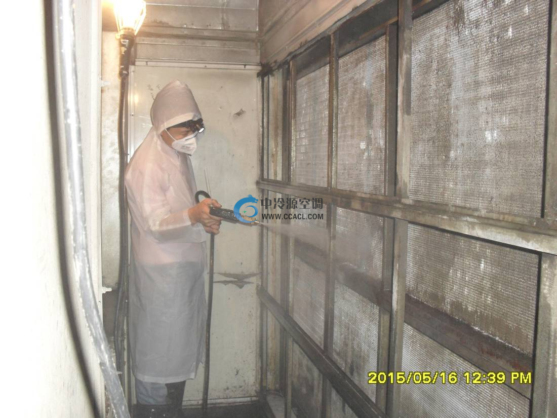 ****店空調賣場制冷效果差,檢查發現落地式風柜翅片嚴重堵塞,過濾網為袋式過濾器,不方便清洗保養,且風輪、接水盤有較多灰塵、污垢,現已按照合同工程清單項目全部完成,清洗、維修完畢后落地式風柜區域效果明顯改善。